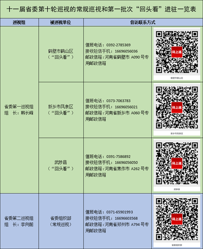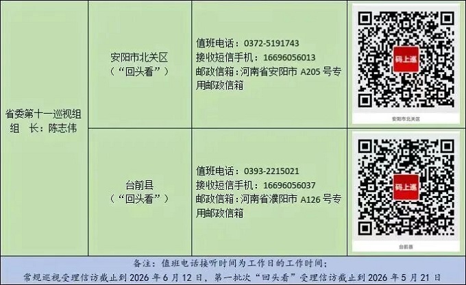 据悉,常规巡视工作时间2个月左右,第一批次“回头看”为1个月左右。巡视期间设立专门值班电话、接收短信手机、邮政信箱、“码上巡”等信访联系方式,主要受理反映被巡视党组织领导班子及其成员、下一级党组织主要负责人和重点岗位人员问题的来信来电来访,重点是关于违反政治纪律、组织纪律、廉洁纪律、群众纪律、工作纪律和生活纪律等方面的举报和反映。其中,常规巡视受理信访时间截止到2026年6月12日,第一批次“回头看”受理信访时间截止到5月21日。