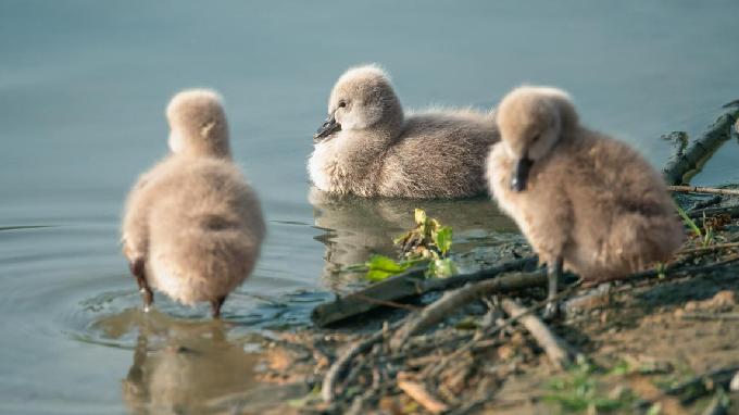 明媚春光照拂着黑天鹅宝宝,一只梳着羽毛,一只立于水边,一只浅游水中,憨态可掬,惹人怜爱。(焦作市山阳区纪委监委 马海芳 摄)