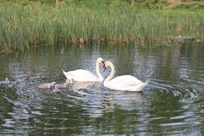 春暖四月,万物生长。郑州北龙湖湿地公园,一对疣鼻天鹅“王子”“公主”带领刚孵出的毛绒绒小宝宝觅食嬉戏。(郑州市纪委监委驻市委政法委机关纪检监察组 徐文华 摄)