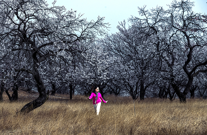 阳春三月,灵宝千亩明清古杏林,朵朵杏花竞相绽放,如雪如霞,游客纷至踏来拍照赏景。(灵宝市纪委监委 刘涝慈 摄)