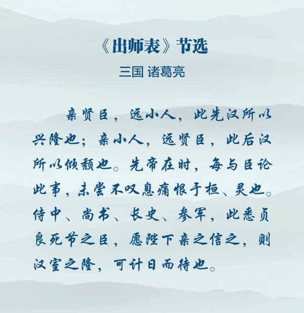 《出师表》以其真挚诚恳的情感和深谋远虑的见地而流传至今。从中,我们不仅能读到一位贤臣对君主的谏言、一位长辈对晚辈的教导,也能读到一代名相对天下大势的分析和思考。
