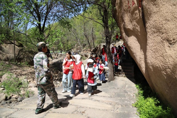 春和景明,西泰山间草木葱茏,一群身着红马甲的研学少年正穿行于炎黄谷的石径之上。汝阳县深挖“炎黄文化”内涵,将西泰山风景区打造为自然教育与传统文化研学基地,通过“旅游+教育+体育”模式,让青少年在山水间强健体魄、增长见识,为乡村振兴培育文旅融合新业态、注入青春活力。(汝阳县纪委监委 张笑颜 摄)