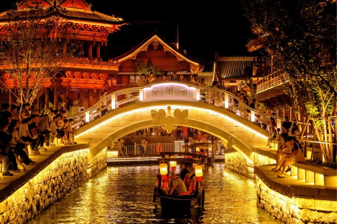 新密市依托历史文化、民俗特色,打造集旅游观光、餐饮娱乐等为一体的特色农文旅产业项目,辐射带动周边乡镇群众就业增收。图为游客在新密市打造的“溱洧水城”里乘船观光,欣赏夜色下的古城风光。(新密市纪委监委供 刘宏恩 摄)