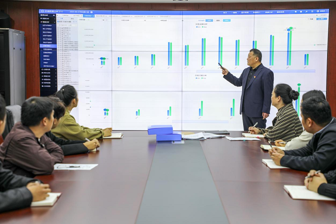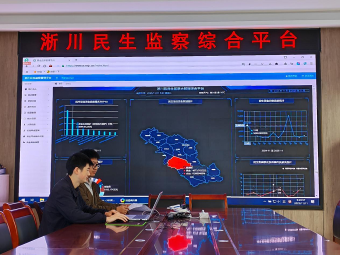 淅川县纪委监委发挥“淅川民生监察”平台监督功能,打通多部门信息壁垒,整合民生数据,比对预警异常。图为淅川县纪检监察工作人员查看民生监察综合平台数据。(淅川县纪委监委 姚娜 摄)
