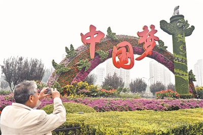 2013年9月30日,一名行人在北京复兴门桥拍摄“中国梦”主题花坛。(资料图片)