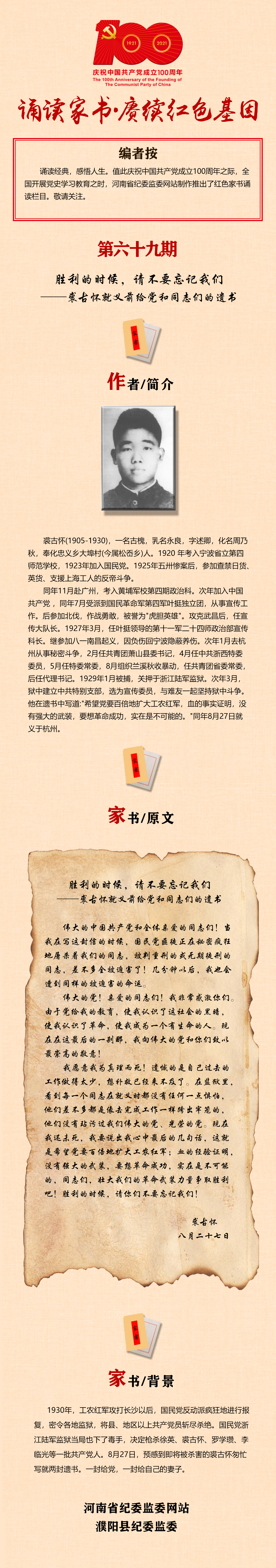 诵读家书·赓续红色基因 第六十九期 | 裘古怀致党和同志们的遗书