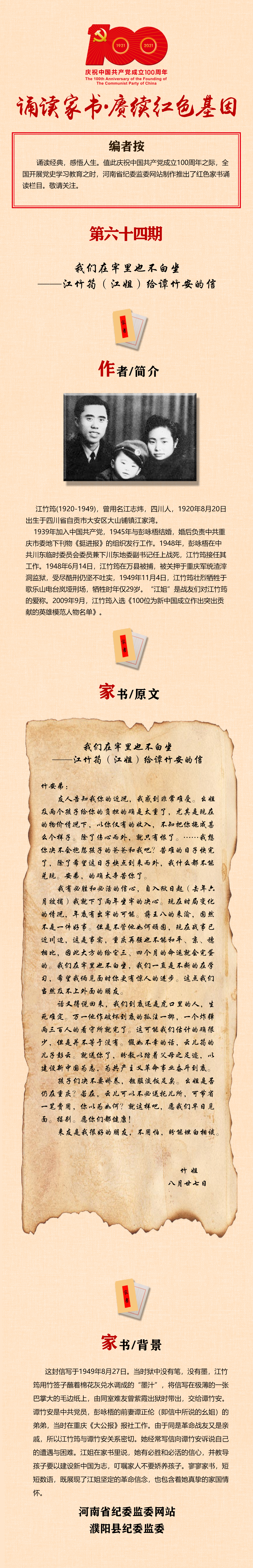 诵读家书·赓续红色基因 第六十四期 | 江竹筠(江姐)致谭竹安的信