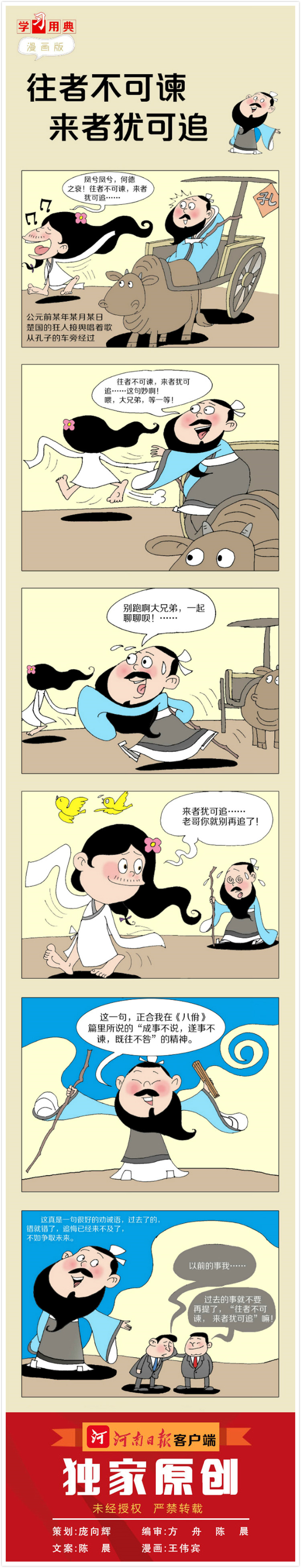 楚国的狂人接舆唱着歌从孔子的车旁经过,他唱道:“凤呀!凤呀!为什么你的德行竟如此衰败?已往的事情不可挽回,未来的事物还来得及争取……”孔子下车,想与他交谈,可接舆是位隐士,放浪形骸,处世理念与孔子相异,所以他不愿与孔子交谈,唱着歌就跑开了。他的形象放到今天来说,有点嬉皮士味道,但他所唱的内容却是非常深刻的。尤其是“往者不可谏,来者犹可追”两句,成为了后世的名言。这句话的意思其实也正合于孔子在《八佾》篇里所说的“成事不说,遂事不谏,既往不咎”精神。“往者不可谏”就是“遂事不谏”,用我们今天的话来说,就是“过去的就让它过去吧,关键是要抓住未来。”