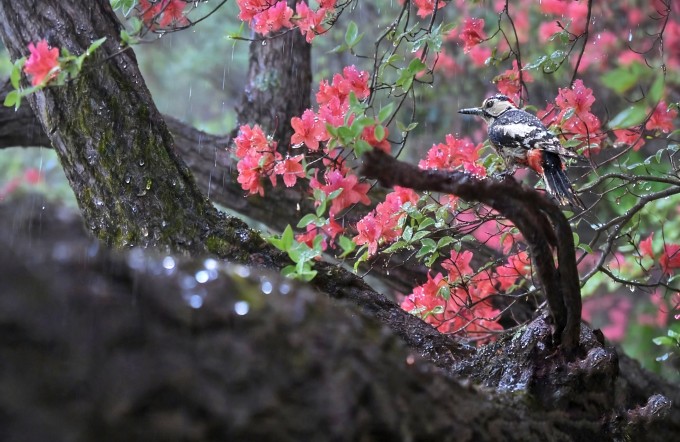 暮春之际,丝丝细雨润开杜鹃花。一只啄木鸟悄立枝头,在枯木上笃笃啄啄,让枯木迎来新生,尽显盎然春意。(商城县纪委监委 李文勇 摄)