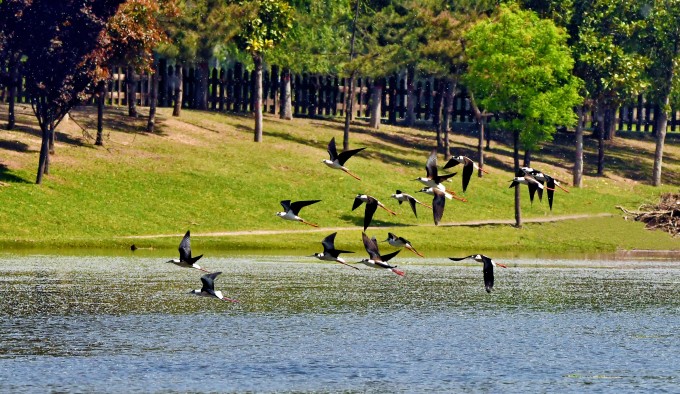 谷雨至,湿地清。黑翅长脚鹬成群掠湖而过,红腿点波,黑翅逐风,以灵动身姿赴暮春之约,尽显生态向好的盎然生机。(温县纪委监委供 王传波 摄)
