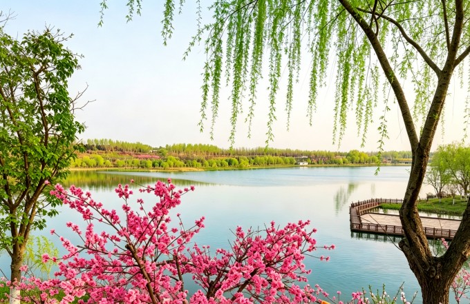 湖畔柳丝轻垂,拂开一川烟霞,繁花灼灼,蘸染满池春水,风携花香漫过栈桥,水映天光藏尽温柔。(新密市纪委监委供 郭新建 摄)