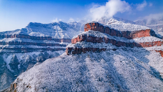 大雪过后,太行山裹上了一层素白的戎装。连绵的峰峦错落起伏,银峰列嶂直抵天际,与淡云薄雾相融,晕出一幅清寂的雪域盛景。(林州市纪委监委 秦阳 摄)
