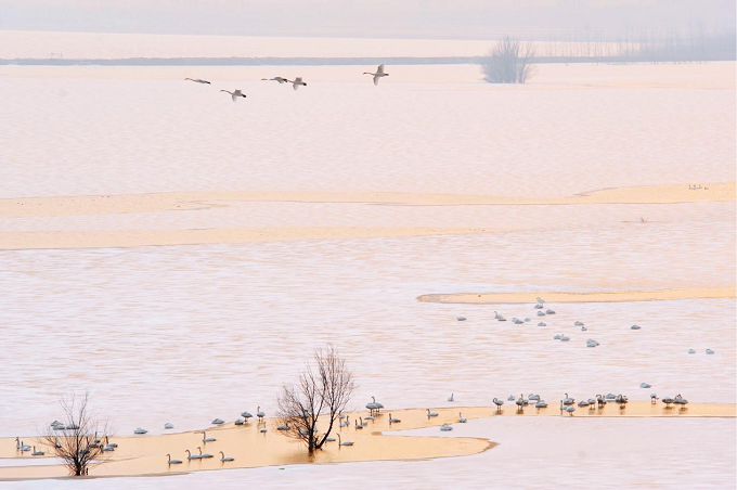 凛冽的寒风中,成群结队的候鸟徘徊在湖面上,凌空飞舞不畏严寒,与冰封的湖面相互映衬,构成一幅美丽的画卷。(新密市纪委监委 周绿坡 摄)
